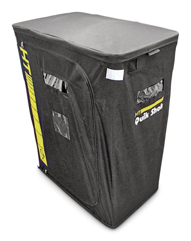 HT Quik Shak is a revolutionary one man portable "Quik Shak" features a floor, sturdy metal pop-up frame system, and a built in fold up chair on the inside that collapses when the unit is folded, and opens when it set-up! HT's "Quik Shak" portable ice houses are completely self-contained, offer a zippered, easy access door for.